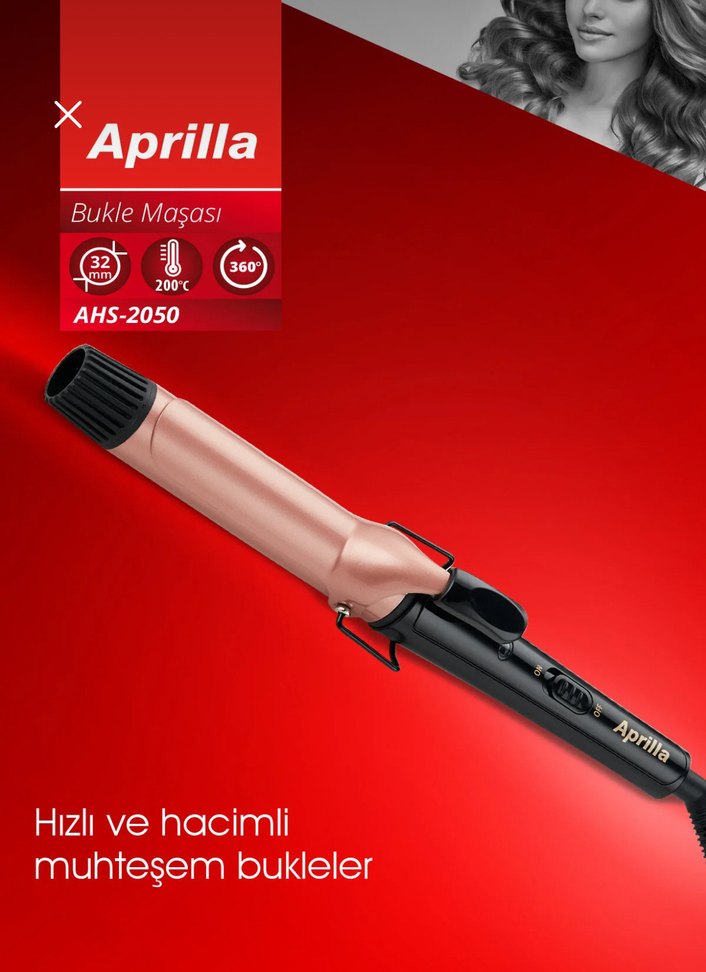 Aprilla AHS-2050 bukle maşası 32 mm varil, 200°C ısı ve 360° dönebilen kablo ile hızlı ve hacimli bukleler oluşturur.