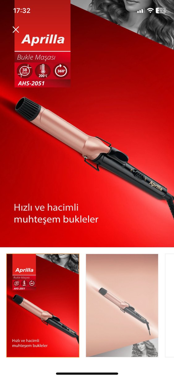 Aprilla AHS-2051 saç maşası, 38 mm varili ve 200°C ısı ayarı ile hızlı ve hacimli parlak bukleler oluşturur. 360° dönebilen kablo ile kullanım kolaylığı sağlar.