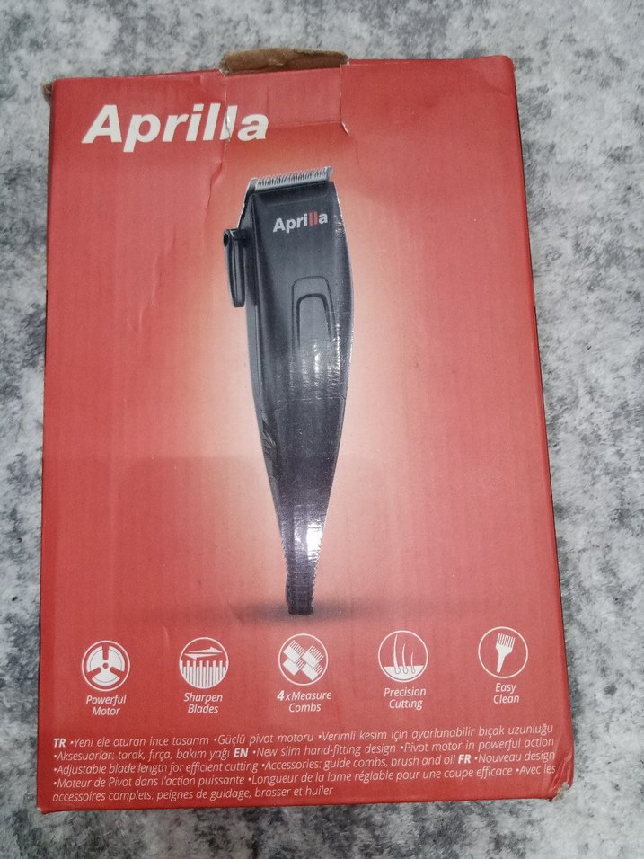 Aprilla siyah elektrikli saç kesme makinesi, güçlü motoru ve hassas kesim bıçakları ile kolay temizlik sağlar. 4 ayarlanabilir tarak ile farklı uzunluklarda kullanım sunar. ✂️ Ürün sıfırdır.