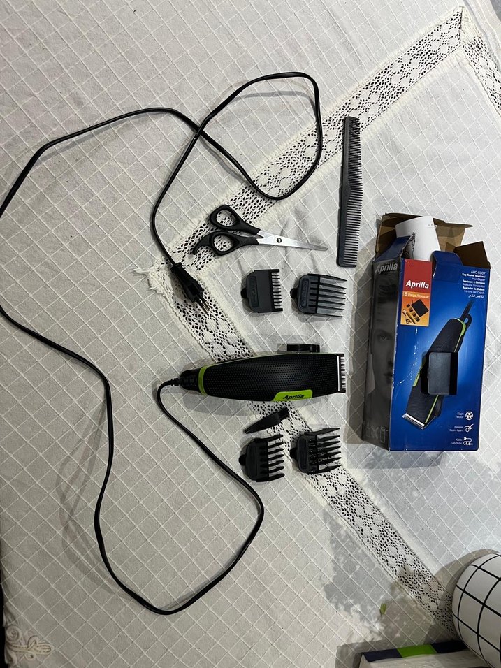 Aprilla siyah gri saç kesme makinesi, farklı taraklar, makas ve tarak ile birlikte. Kablolu elektrikli tasarım, kesintisiz kullanım sağlar. ✂️ Kutulu faturalı tam set sadece bir kez kullanıldı temizlenip kaldırıldı