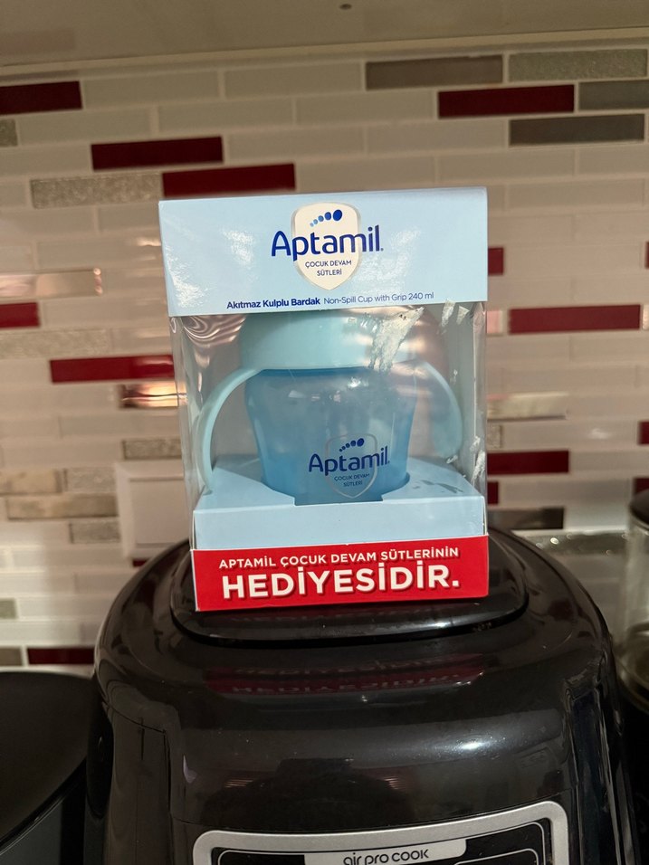 Aptamil marka, 240 ml kapasiteye sahip, dökülmeyi önleyen kulplu mavi bebek bardağıdır. Aptamil devam sütü hediyesiydi hiç kutusu açılmadı Sıfır el değmemiş ürün⚠️