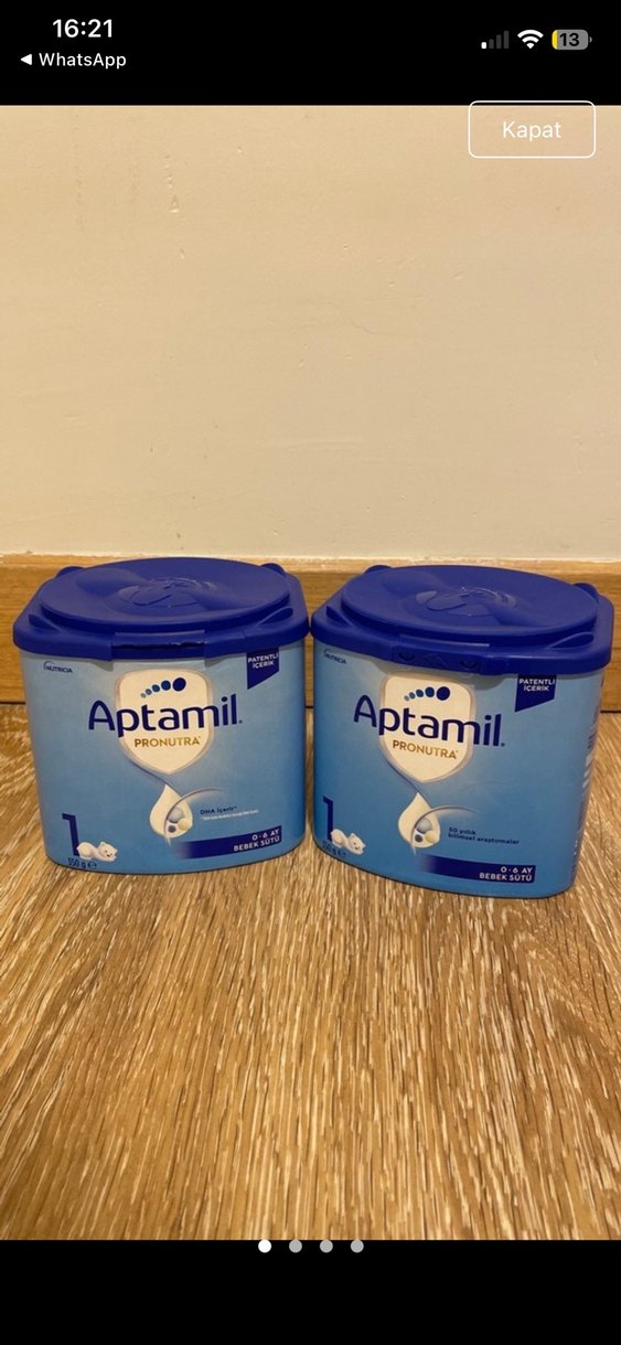 0-6 ay bebekler için Aptamil Pronutra bebek sütü tozu, pastel mavi kapaklı kutularda sunulmuştur.