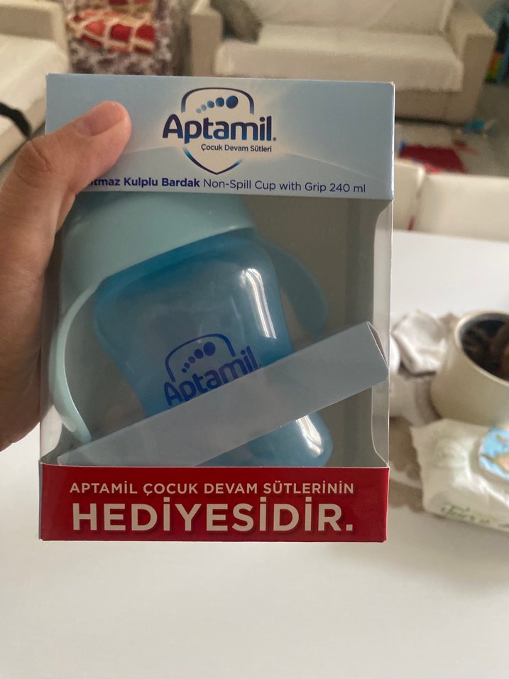 Aptamil mavi kulplu, kaydırmaz bardak 240 ml kapasiteye sahiptir. Aptamil çocuk devam sütleriyle birlikte hediye olarak sunulmaktadır. Sifir urun