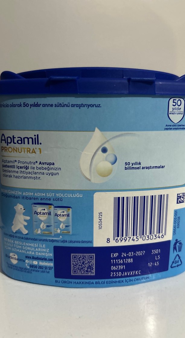Aptamil Pronutra 1 bebek sütü tozu, ışık mavi ambalajda, bebeğin beslenme ihtiyaçlarına uygun patentli içerikle hazırlanmıştır. 50 yıllık bilimsel araştırmalarla geliştirilmiştir.