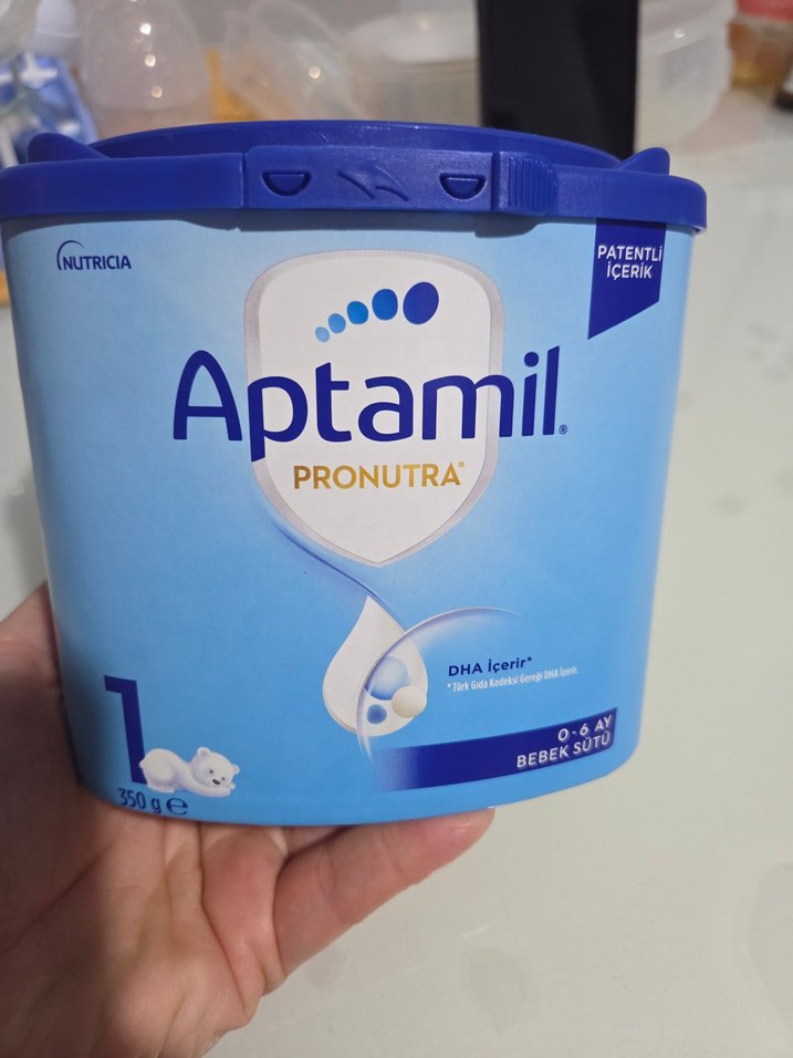 Pastel mavi ambalajda Aptamil Pronutra bebek sütü, DHA içerir. 0-6 ay bebekler için uygundur. Ürün ağırlığı 350 gramdır. Ürün hiç kullanılmamıştır. market fiyati 550 liradır.