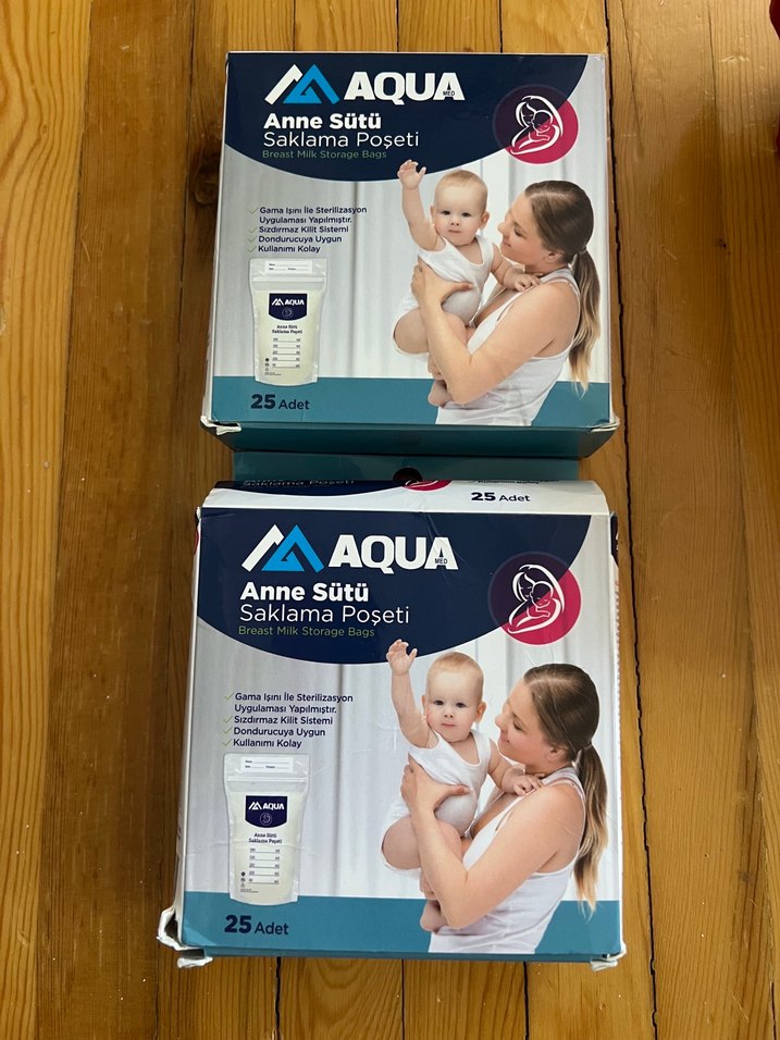 Pastel mavi renkte Aqua marka, 25 adet anne sütü saklama poşeti. Hijyenik ve dondurucuya uygun saklama sağlar.