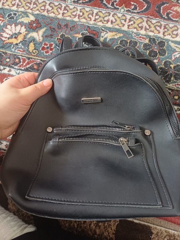 Siyah deri sırt çantası çoklu fermuarlı ceplerle günlük sokak stiline uygun minimal bir tasarıma sahiptir. Suni deri. Az kullanılmış. Görünürde bir defosu yok. Arka askısının bir-iki dikişi çıkmış sadece. Onu da fotoğraflarda belirttim. Küçük ama yetişkinler de rahatlıkla kullanabilir.