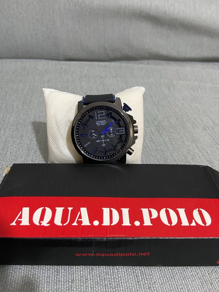 Aqua Di Polo marka, koyu mavi renkli, biker tarzı erkek saati. Siyah kadran ve mavi detaylarla şehirli stil sunar. Kronograf özellikli.