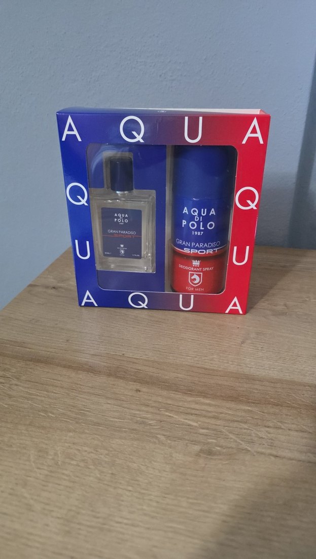Aqua Polo Gran Paradiso Sport erkek parfümü ve deodorant spreyi, canlı kırmızı ve mavi kutusunda sunulmaktadır.
