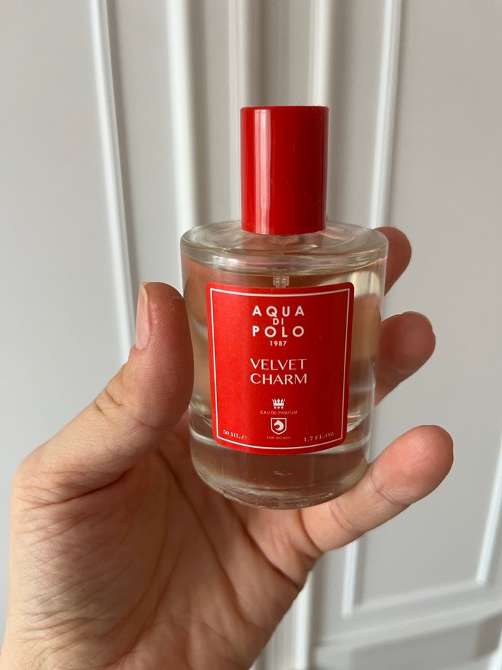 Aqua Polo Velvet Charm, 50 ml şişede, kırmızı kapak ve etiketle sunulan zarif ve yumuşak kokulu kadın parfümüdür.