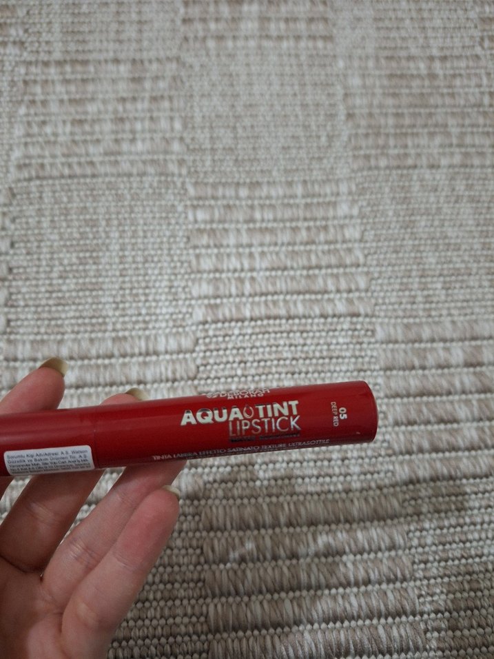 Canlı kırmızı renkte Aqua Tint ruj, kolay sürüm için pürüzsüz dokulu.