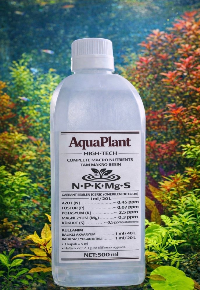 AquaPlant, azot, fosfor, potasyum, magnezyum ve kükürt içeren tam makrobesin. Balıklı akvaryum ve yoğun bitkiler için 500ml şişede, dozaj talimatlı.