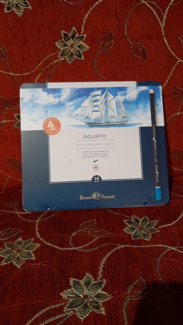 AquaPro kuruboya seti, 24 renk ve fırça içerir. Metal kutuda, yelkenli gemi tasarımıyla sunulur.