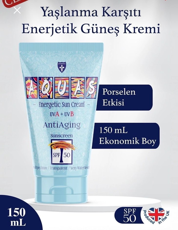 AQUAS Enerjik Güneş Kremi SPF 50, UVA ve UVB ışınlarına karşı koruma sağlar ve anti-aging özellik taşır. Transparan ve suya dayanıklıdır. ☀️
