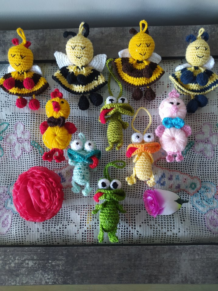 El yapımı bohem tarzda örgü figürler, arılar, kurbağalar ve çiçekler canlı renklerle. Her parça detaylı ve dekorasyon için uygun .