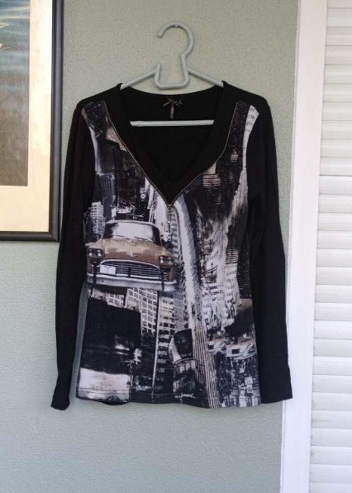 Araba baskılı çift yaka baskılı bluz. Boy 63 cm iki koltuk arası 45 cm. Sorunsuz SORMADAN BİRLEŞTİRME YAPMAYIN