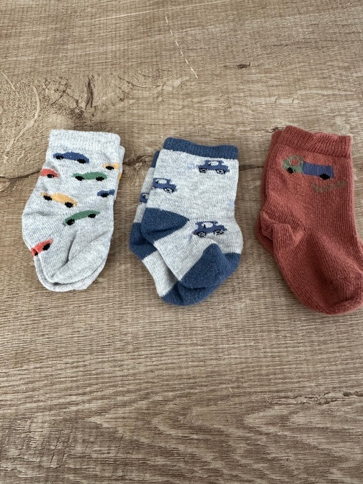 Araba desenlerine sahip, gri tonları ve canlı detaylar içeren çok renkli erkek bebek çorap seti. 0-6 ay arası rahatlıkla giyebilir. Rahat ve yumuşak kumaş. Hiç giyilmedi, H&M markası.