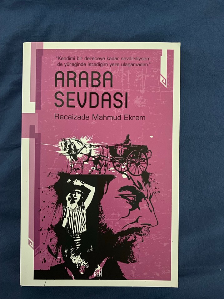 Recaizade Mahmud Ekrem'in "Araba Sevdası" adlı romanı, sanatsal illüstrasyonlu klasik bir kapak tasarımına sahiptir. Duygusal bir alıntı içerir.