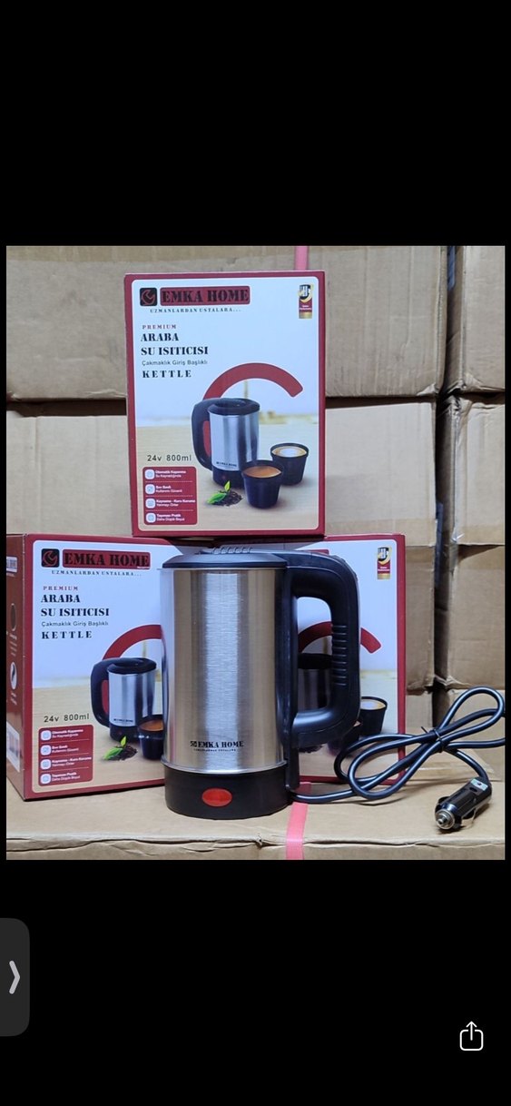 Gri renkte 800 ml kapasiteli, 24V araba bağlantılı su ısıtıcısı. Paslanmaz çelik gövde ve siyah tutma sapı bulunur.