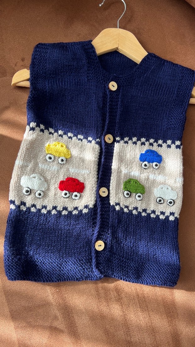 Renkli nakışlı arabalarla süslenmiş, lacivert 0-2 yaş arası rahat kullanılır el örgüsüdür