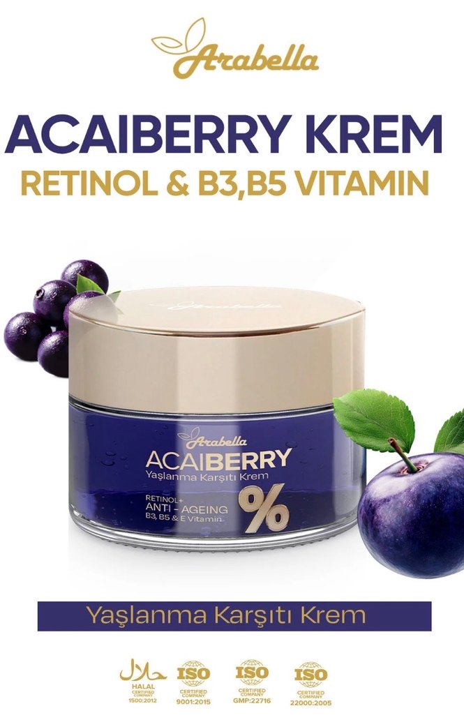 Arabella Acai Berry krem, retinol ve B3, B5 vitaminleri içerir. Kadınlar için yaşlanma karşıtı nemlendiricidir.