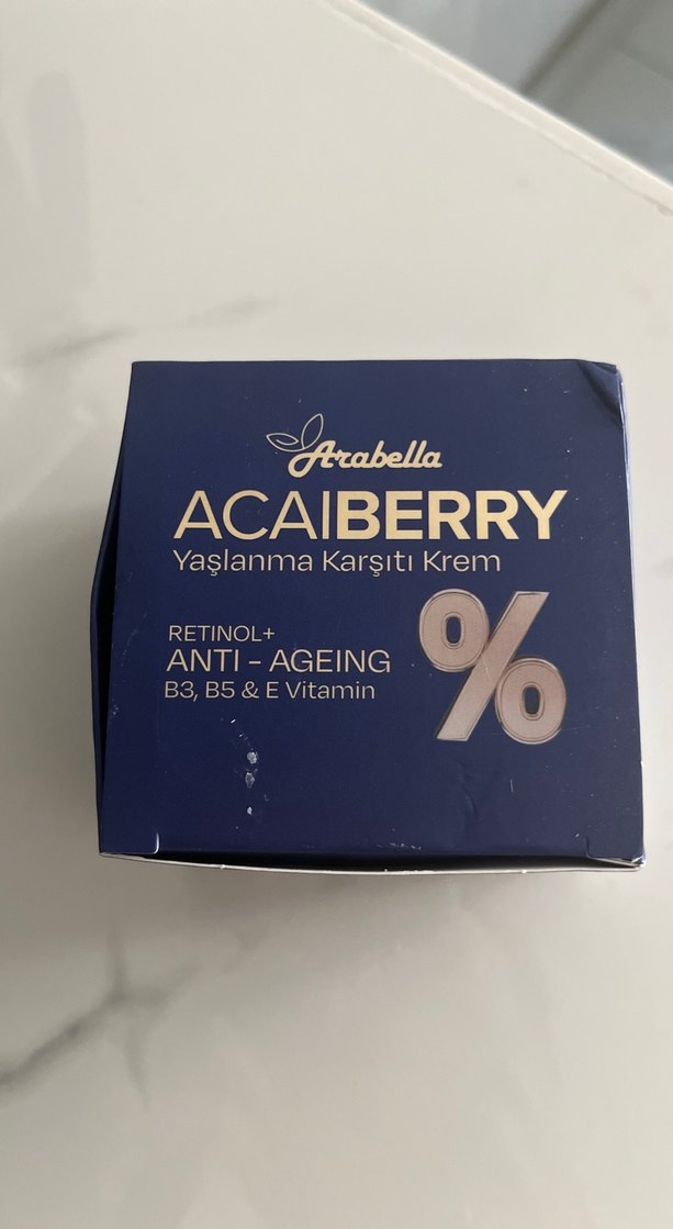 Arabella AcaiBerry yaşlanma karşıtı krem, retinol ve B3, B5, E vitaminleri içerir. Yaşlanma belirtilerini azaltmaya yardımcı olur. Koyu bordo kutuda.sıfır