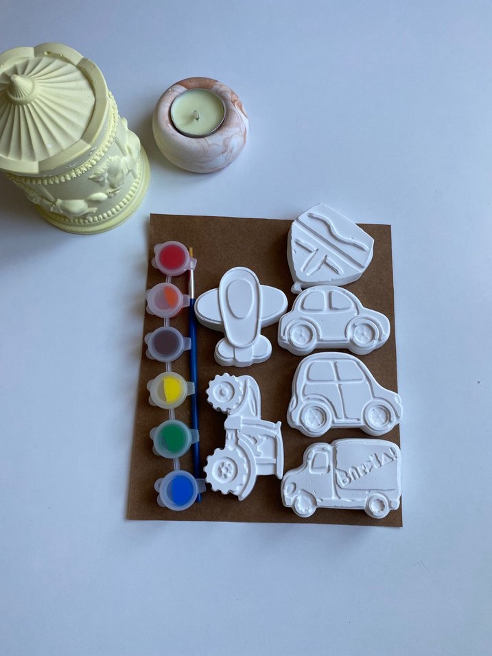 Altı renk boya ve fırça içeren araç figürlü taş boyama seti. Araba, uçak ve kamyon gibi şekiller bulunur.