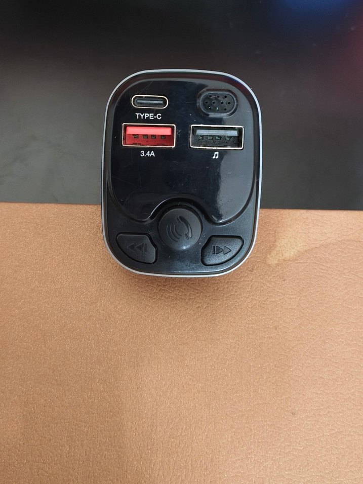 Araç içi çakmaklık telefon şarj cihazı, Type-C ve USB portları ile 3.4A çıkış sağlar, kontrol düğmeleri bulunur. Kompakt ve kullanışlı tasarım.