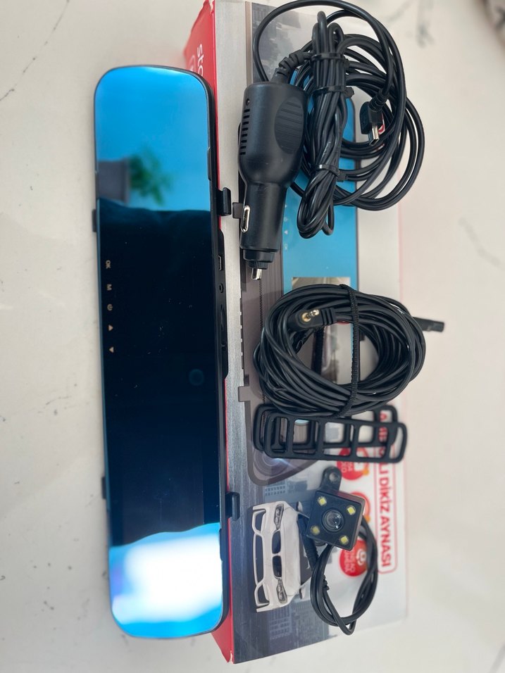 Koyu mavi renkte Bluetooth özellikli araç kiti, aynaya monte cihaz, güç adaptörü ve bağlantı kabloları içerir.