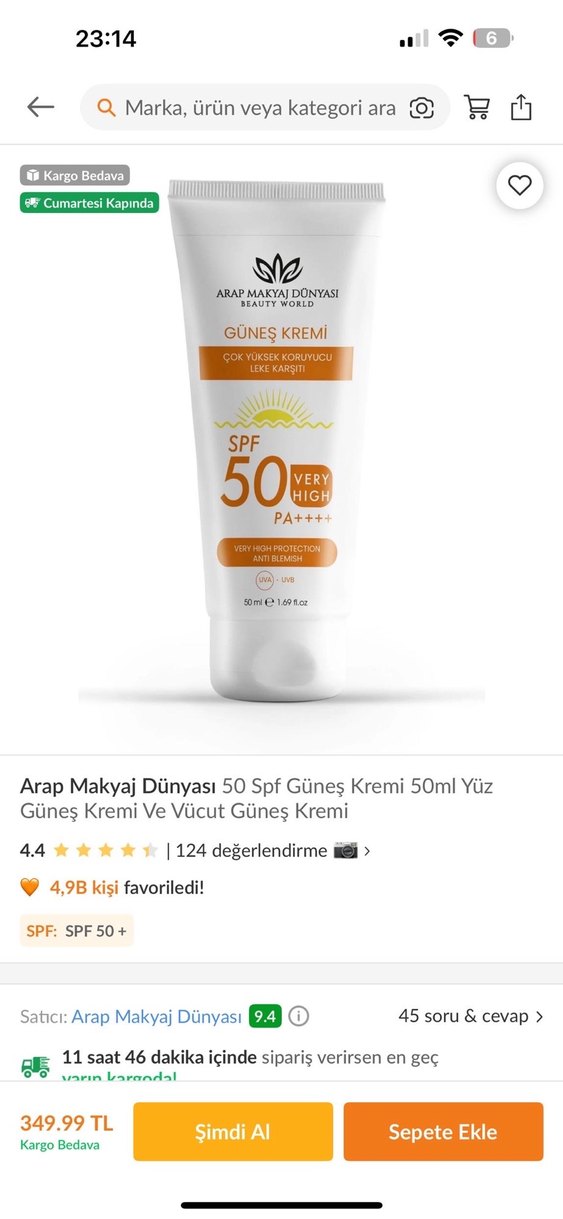 Arap Makyaj Dünyası 50 SPF güneş kremi, PA++++ koruma sağlar ve leke karşıtı özellik taşır. Yüz ve vücut için uygundur. 50ml tüpte sunulur. ☀️hiç kullanılmadı