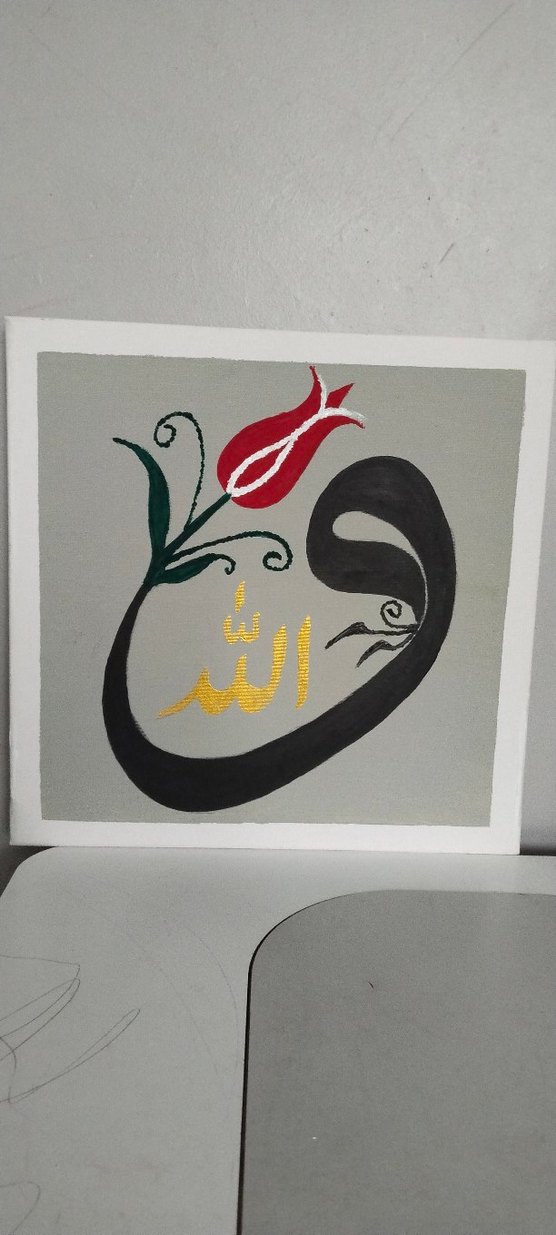 Gri zemin üzerinde Arapça hat yazısı ve kırmızı lale figürü bulunan tablo. Geleneksel yazı ve çiçek deseni bir arada. istediğiniz görseli atıp tasarlayalim.