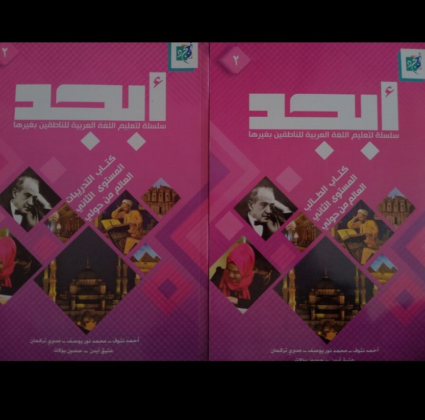 Orta ve ileri seviyeler için Arapça öğrenim kitapları, kültürel ve tarihi görsellerle desteklenmiş iki ciltlik set. Hiç kullanılmamış