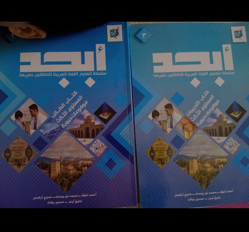 Başlangıç seviyesinde Arapça öğrenme kitapları seti, görsel destek ve kültürel görüntüler içerir. Hiç kullanılmamış