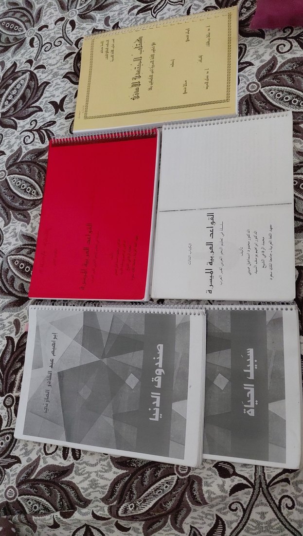 Ders ve sınavlar için Arapça kitap seti, spiral ciltli ve farklı başlıklara sahip.