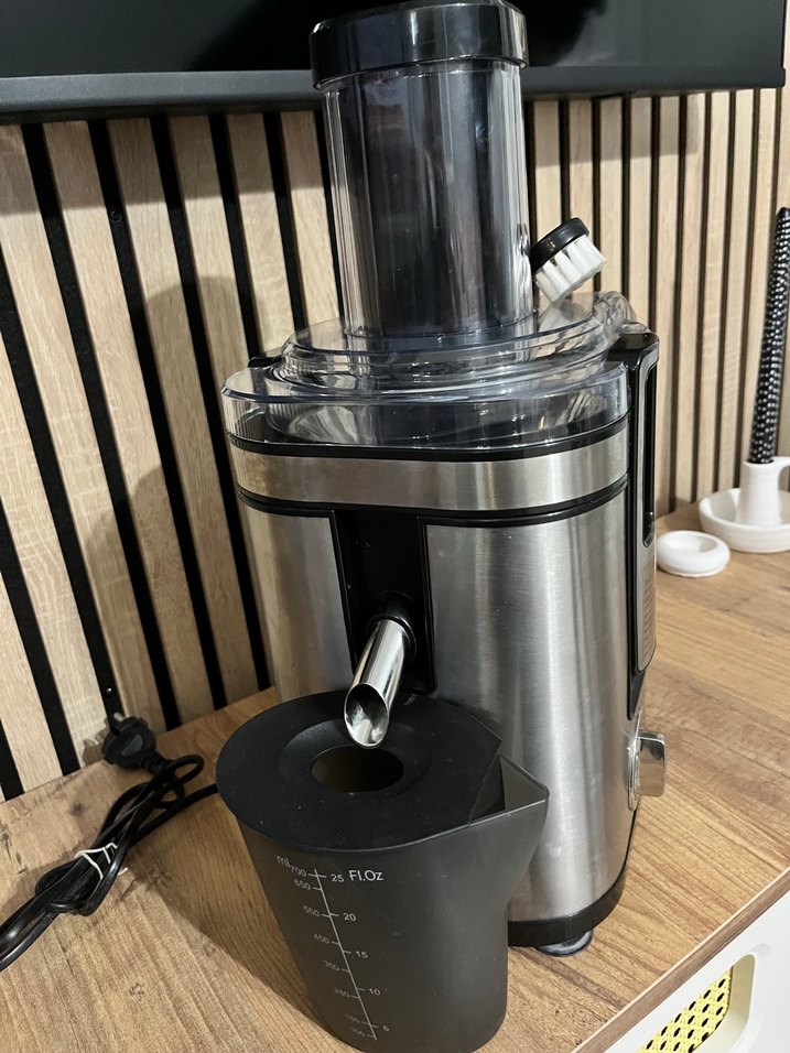 Gri renkte, paslanmaz çelik gövdeli, şeffaf besleme tüplü ve üzerinde ölçü işaretleri bulunan siyah meyve suyu kabı olan katı meyve sıkacağıdır. Güç kablosu mevcuttur. Bir defa deneme amaçlı kullanıldı. Her parçası mevcut herhangi bir defosu bulunmamaktadır.