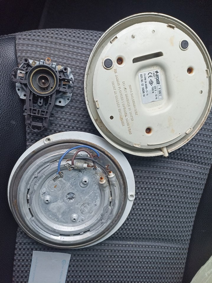 Beyaz ve gri renkli elektrikli su ısıtıcısının taban ve ısıtıcı elemanı gibi parçaları, iç bileşenler görünür. hepsi toplu şekilde satılacaktır ⚙️