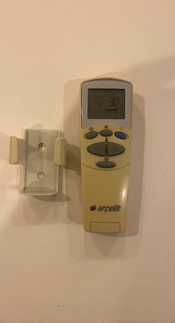 Açık renkte Arçelik klima kumandası ve duvar tutucu. LCD ekranında sıcaklık ayarları gösterilir, kullanımı kolay düğmeler bulunur. ❄️