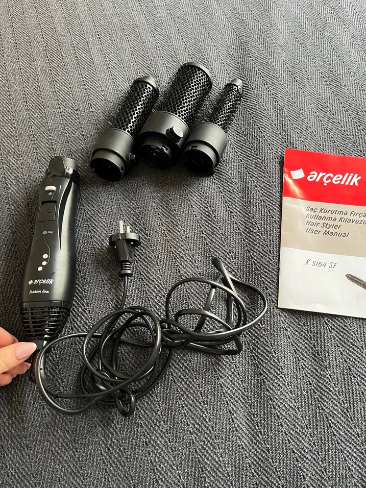 Arçelik siyah saç şekillendirici seti, üç farklı yuvarlak fırça başlığı ve kullanım kılavuzuyla birlikte gelir. ⚫