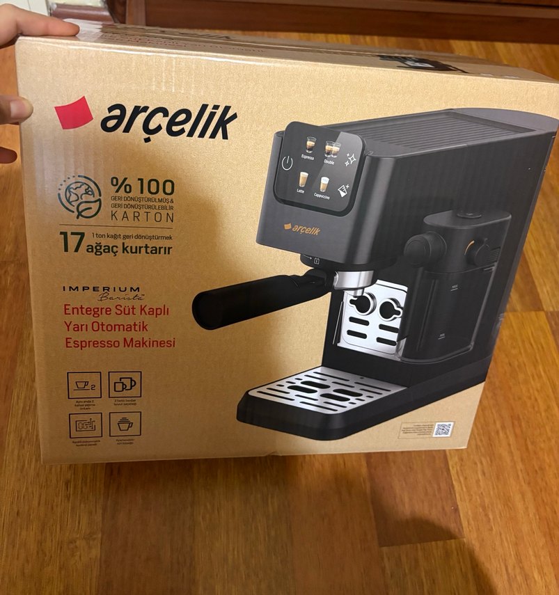 Arçelik yarı otomatik espresso makinesi, entegre süt kaplı ve siyah renkte tasarlanmıştır. Ürün kutulu açılmamıştır. Hediye gelmiştir.
