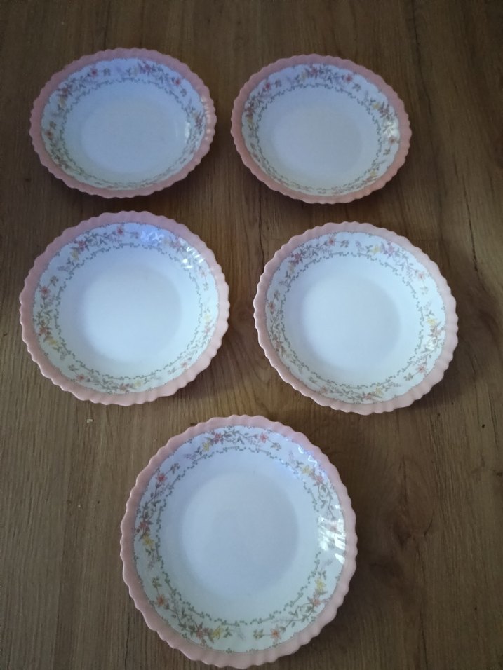 20 cm dir hiç kullanılmamış Pastel pembe dalgalı kenarları ve zarif çiçek desenleri olan 5 parça tabak seti. Yumuşak ve şık bir sunum için ideal. ️