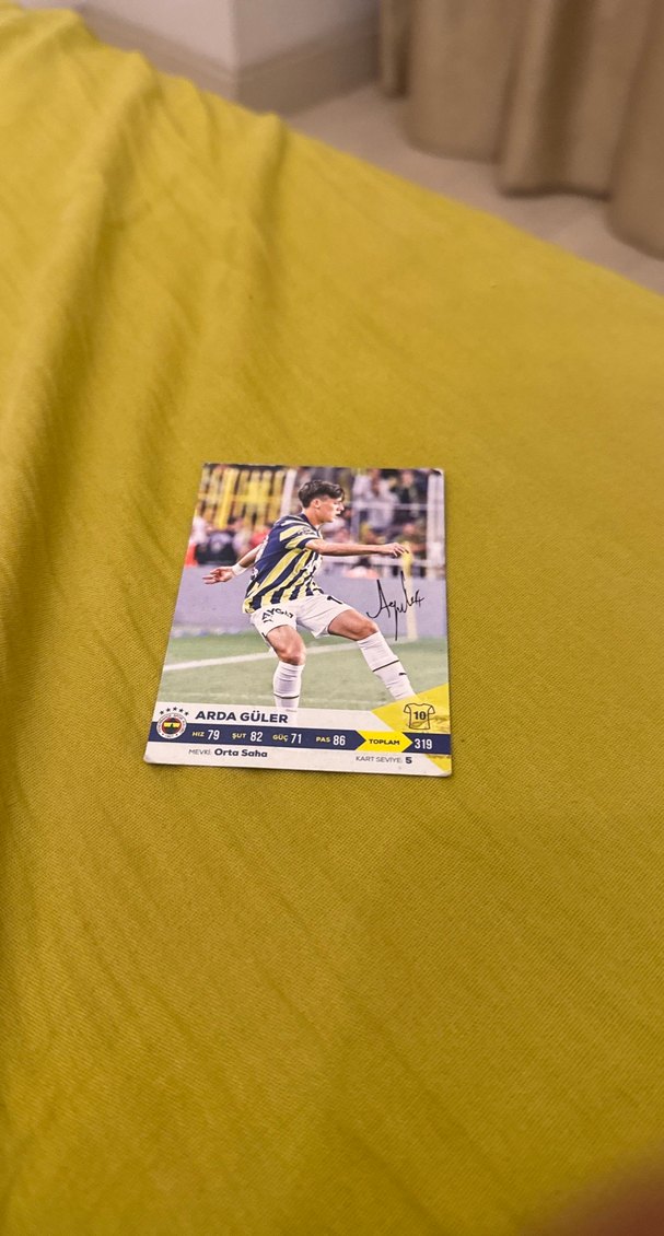 Fenerbahçe formasıyla Arda Güler futbol kartı. Oyuncu istatistikleri, imza ve pozisyon bilgileri içerir. Spor koleksiyon kartı ⚽️.