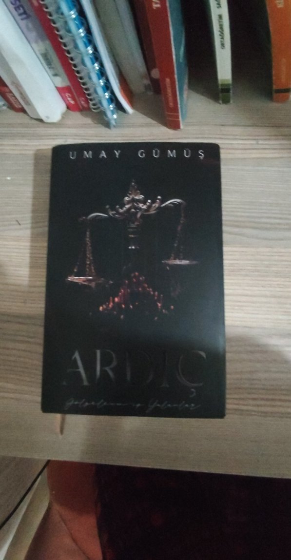 Umay Gümüş'ün "Ardıç" adlı romanı, adalet veya denge temalarını çağrıştıran terazi simgesiyle koyu kapaklıdır.