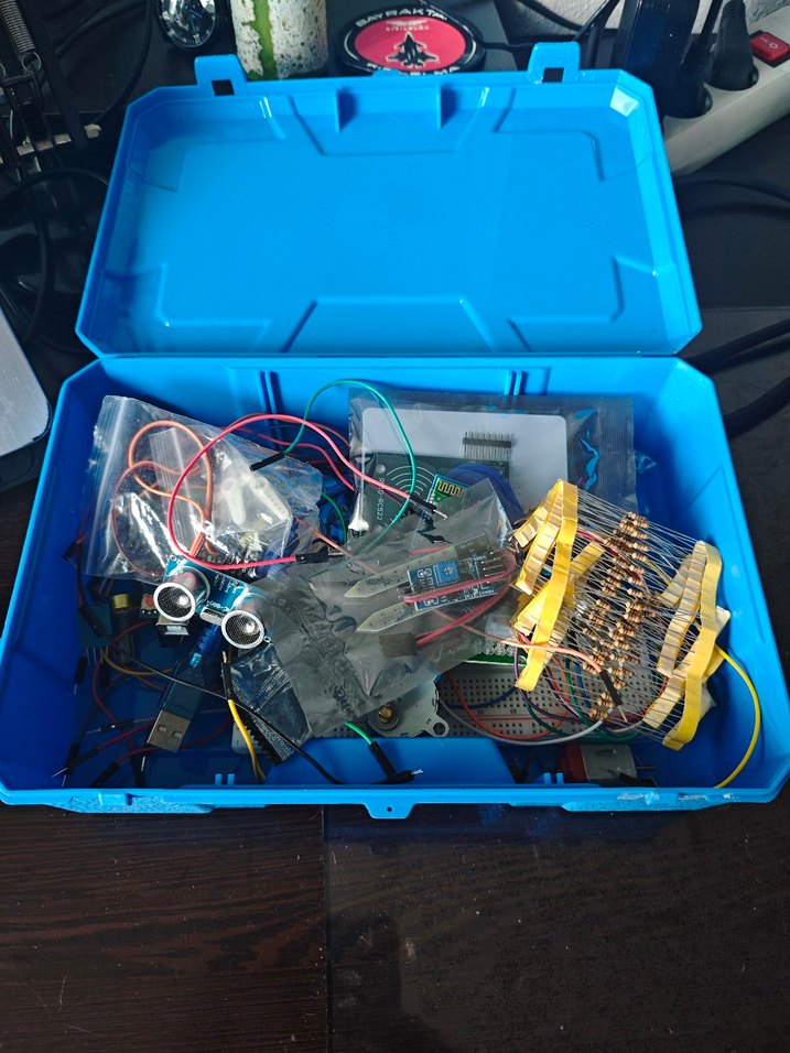 birkaç kere kullanıldı çoğu malzeme sıfir Çeşitli elektronik bileşenler ve kablolar içeren koyu mavi plastik kutu.