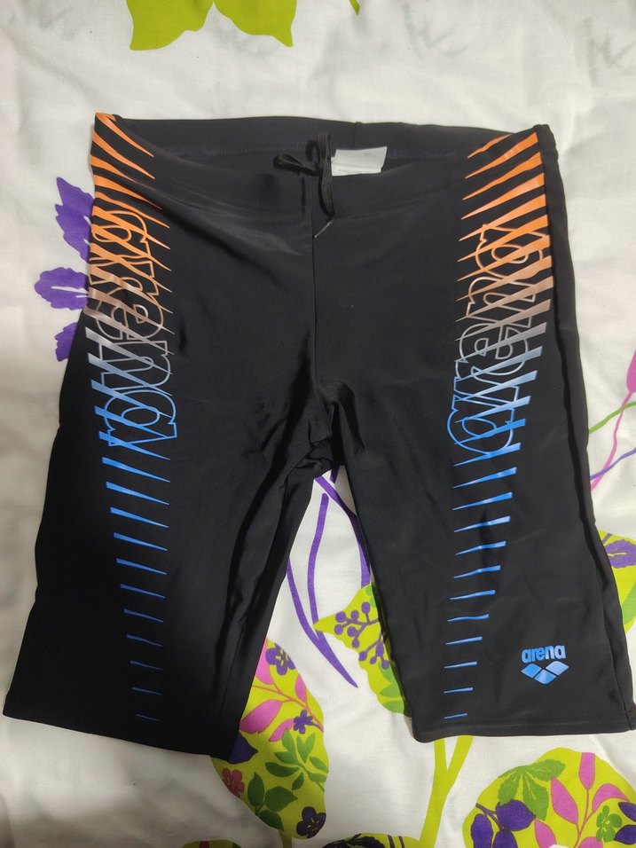 Arena markalı, elastik bel bantlı, çok renkli desenli, kısa ve vücuda oturan erkek mayo şortu, spor ve sokak tarzı için uygundur.