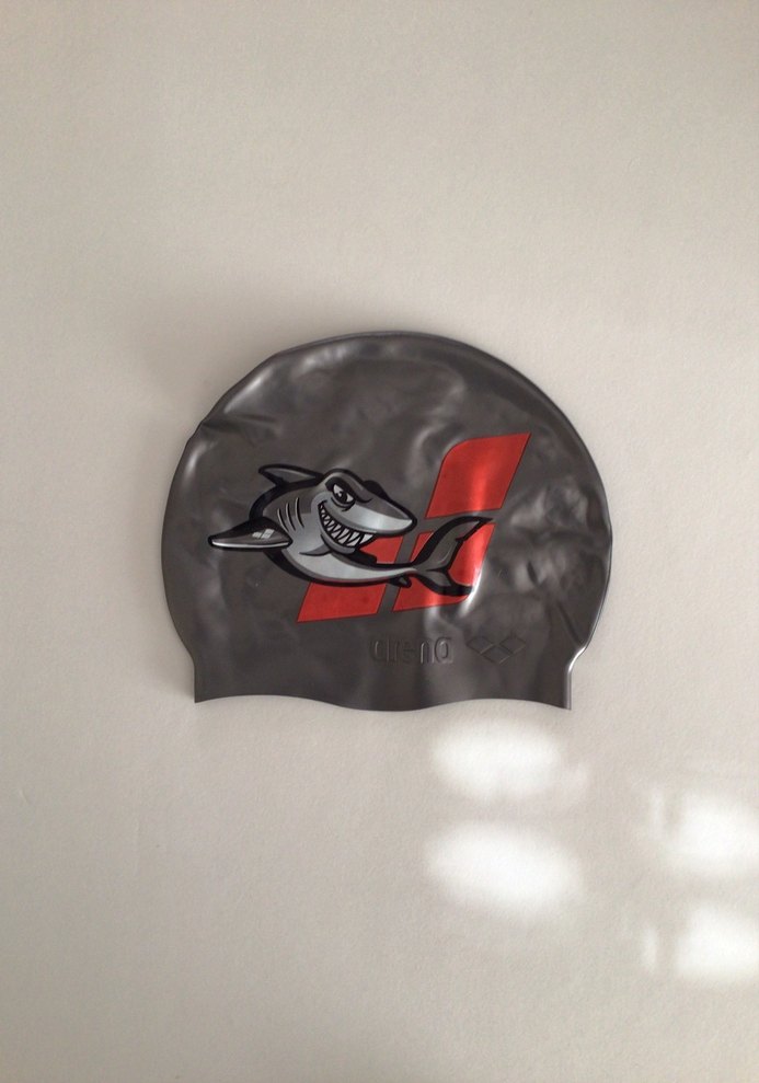 Gri renkli yüzme bonesi, 20 cm ,üzerinde kırmızı detaylı köpekbalığı grafiği ile rock punk ve athleisure tarzını yansıtıyor.