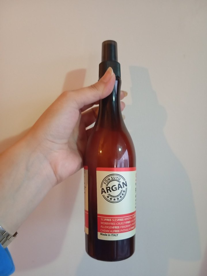 İçeriğinde argan yağı bulunan. Saçı nazikçe besler. saç spreyi fön suyu