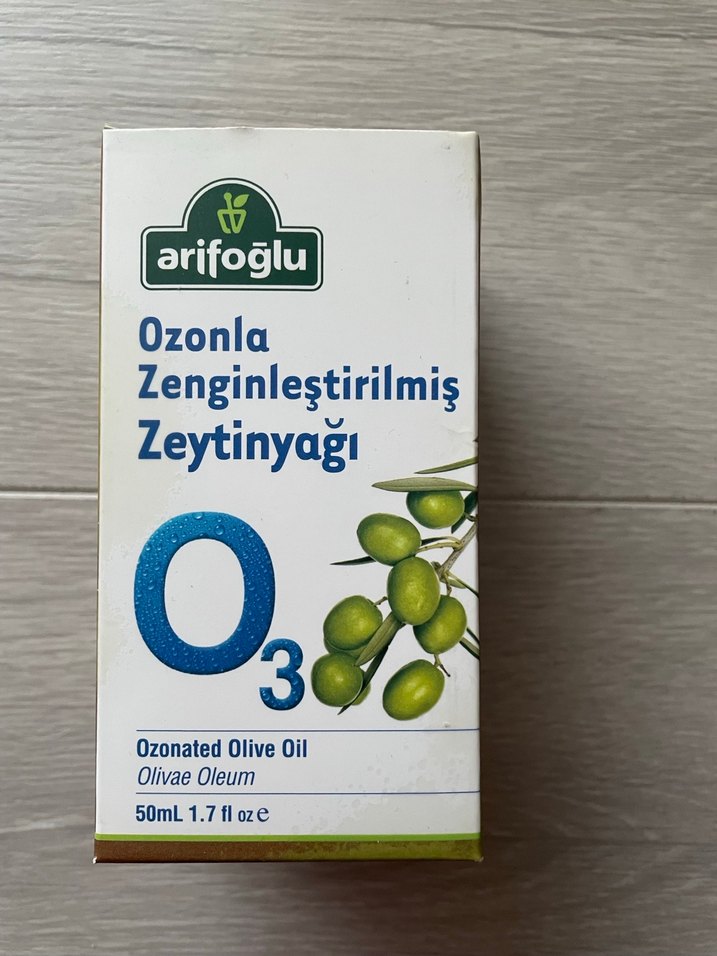 Arifoğlu markasına ait 50ml ozonla zenginleştirilmiş zeytinyağı, cilt bakımına doğal destek sağlar. Çok az kullanılmış fotoğrafta görünüyor. Son kullanma tarihi kutunu üzerinde yazıyor.