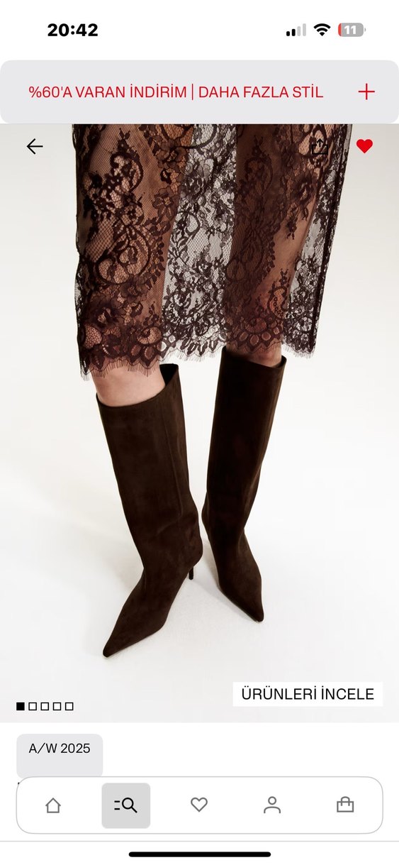 Kahverengi süet diz boyu botlar, stiletto topuklu ve ince yılan derisi desenlidir. Gotik Paris tarzıyla romantik geceye uygun dantel detaylıdır.