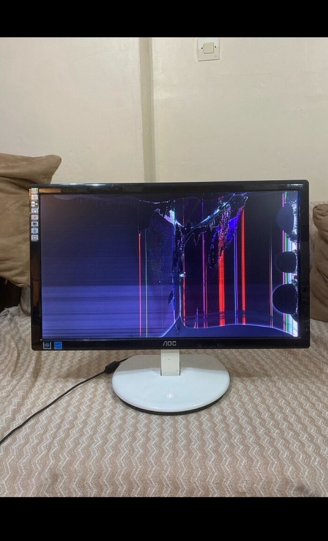 Ekran arızalı panel kırık yedek parça niyetine satıyorum Beyaz AOC monitör, ekranında renkli dikey çizgiler ve çatlaklar bulunan ciddi hasarlı ekranla birlikte. Yuvarlak tabanlı ve açık durumda. İade kabul etmiyorum