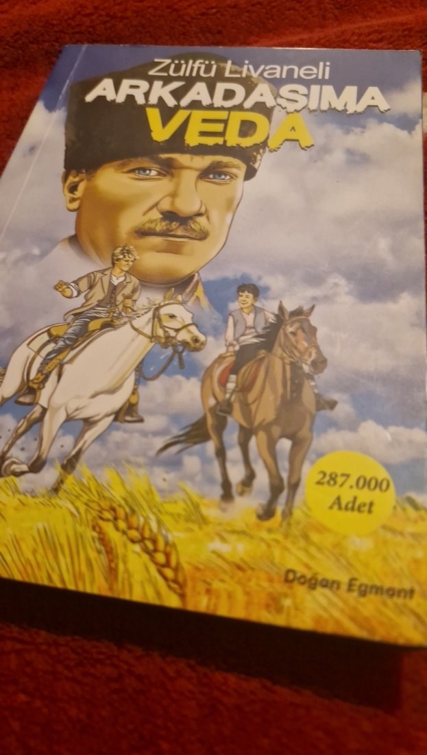 Doğan Egmont imzalı "Arkadaşıma Veda" kitabı, tarih temalı, at sırtında karakterlerin bulunduğu illüstrasyonlarla dolu bir eserdir.